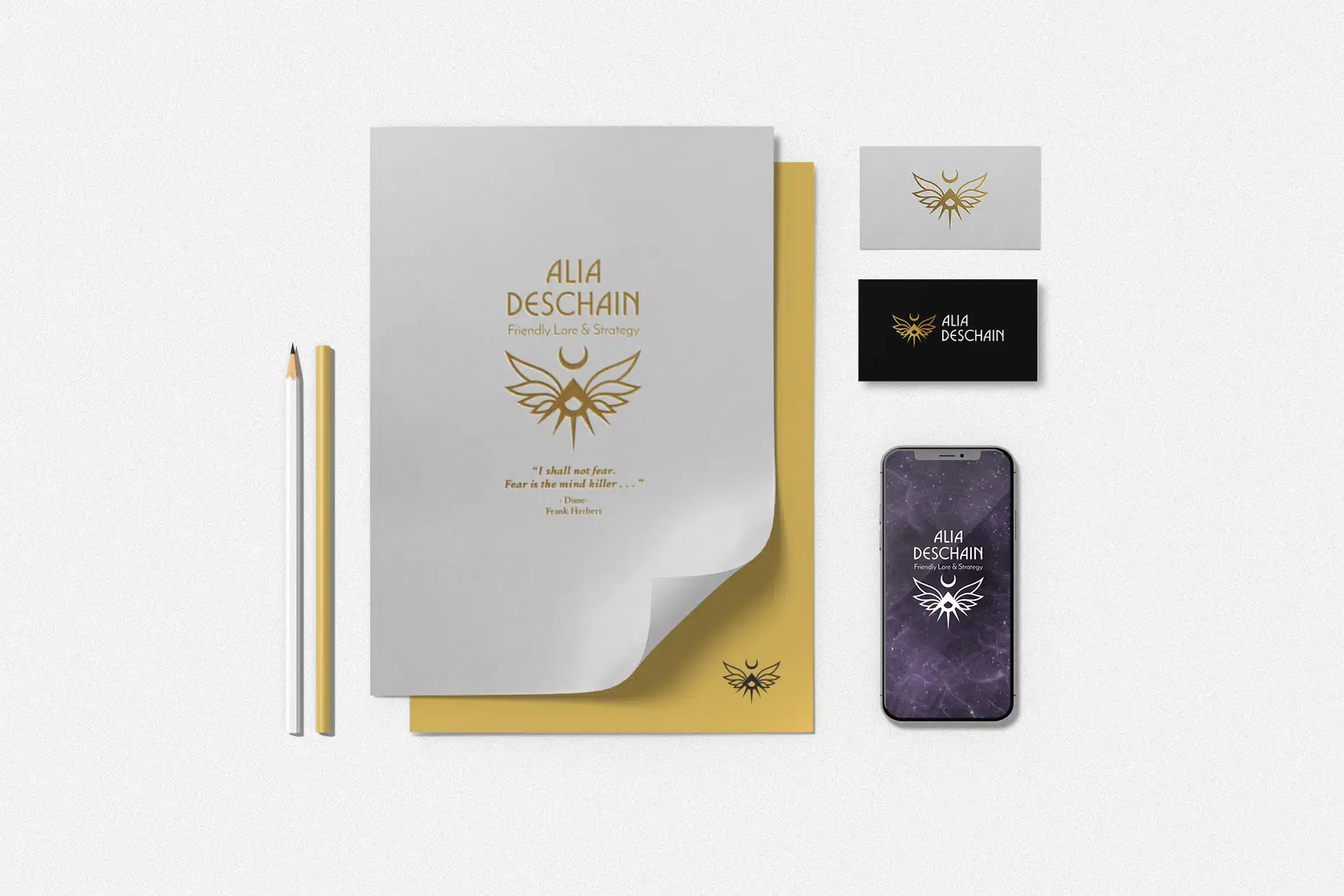La identidad que creé para Alia Deschain, embajadora de marca de Magic: The Gathering y especializada en juegos de rol y lore, está inspirada en su afinidad con los personajes ángeles guerreros y su nobleza de espíritu. El isotipo combina una ‘A’ estilizada con rayos solares aludiendo al maná blanco de Magic, alas angélicas y una media luna (femineidad), creando un símbolo simétrico que evoca fuerza y espiritualidad. La tipografía, de estilo Art Déco, equilibra delicadeza y fortaleza, con la paleta de colores blanco, dorado y violeta remite a la nobleza y energía cósmica. Esta marca no solo es elegante y poderosa, sino también accesible y femenina. Assets como texturas abstractas que añaden una dimensión energética y mística se alinean con la esencia de Alia.