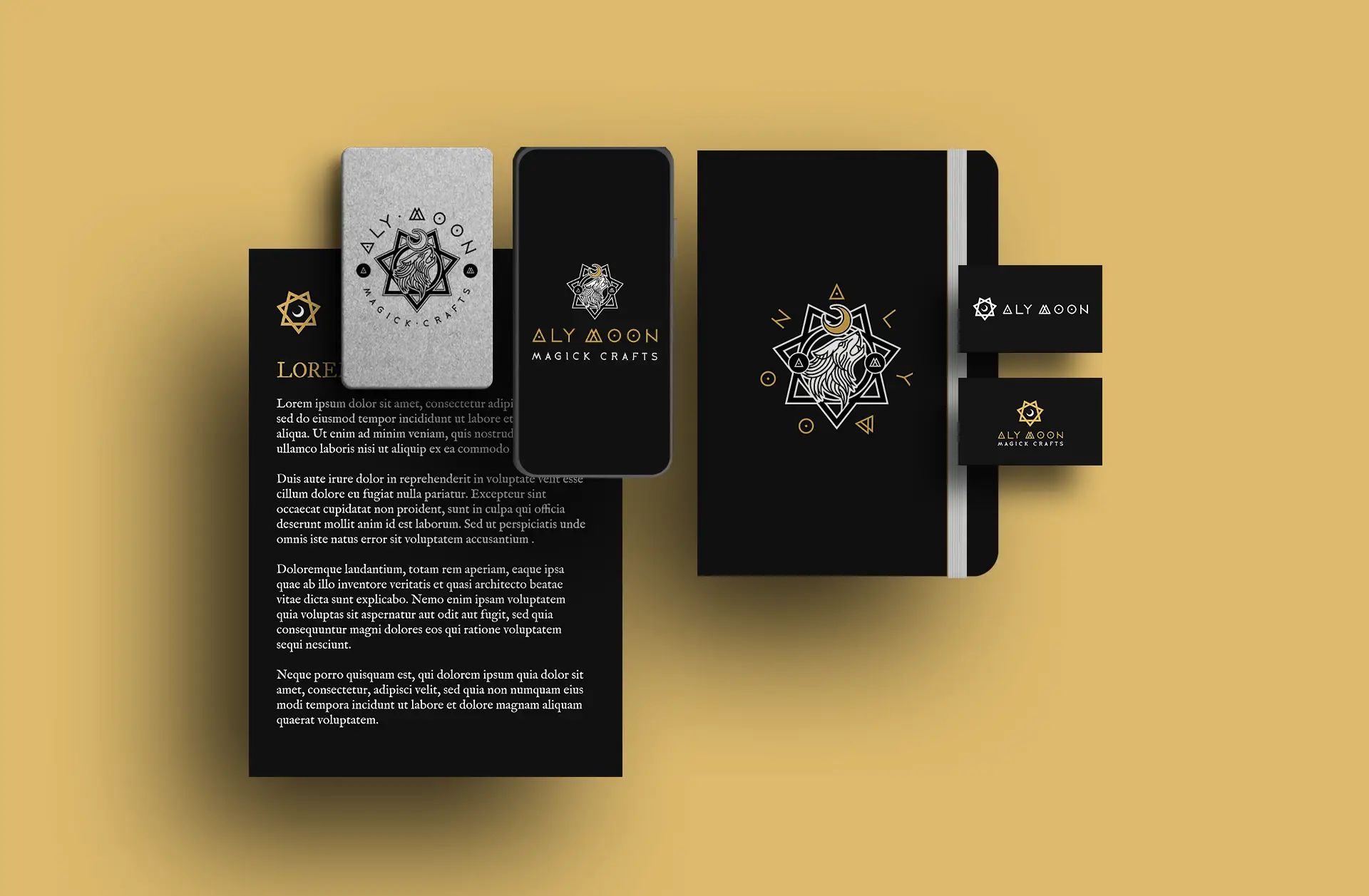 Para esta marca de artesanía textil, como requisito, se mantienen tanto el color dorado como la figura de un lobo y la luna, del anterior logo de la marca, y se inscribe en una estrella de siete puntas, la cual deja claro en un vistazo que la marca está relacionada con las prácticas esotéricas. Se han creado diversas versiones, desde la más decorativa y críptica a la más minimalista donde el símbolo es sintetizado a una estrella y una luna para las aplicaciones con un tamaño más reducido. El tratamiento de trazos geométricos, tanto en símbolos como tipografía, nos recuerda a los sellos mágicos y runas, haciendo una marca con una imagen potente, clara y versátil para su uso en cualquier lugar.