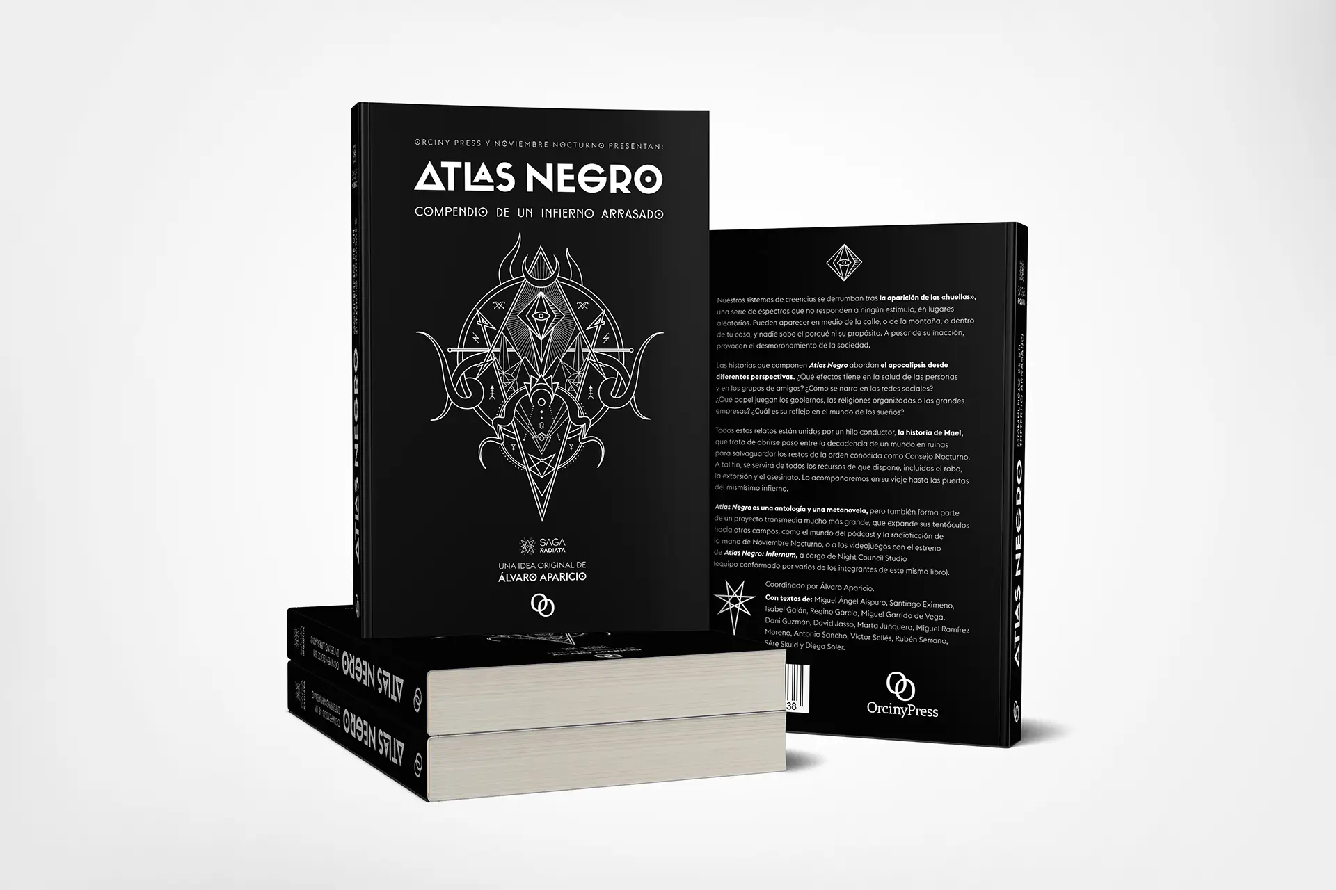 La portada de esta antología de horror cósmico escrita por varios autores y publicada por Orciny Press, "Atlas Negro", evoca la estética de antiguos grimorios con un enfoque moderno. Sobre un fondo negro liso, se presenta un símbolo complejo trazado en líneas blancas finas, inspirado en el ocultismo y el horror cósmico. Este diseño alude a seres y portales de otras dimensiones, creando una sensación de misterio y trascendencia. La tipografía, una sans-serif geométrica experimental, refuerza la atmósfera esotérica al recordar símbolos geométricos esotéricos, integrándose perfectamente con el tono oscuro y enigmático de la obra.