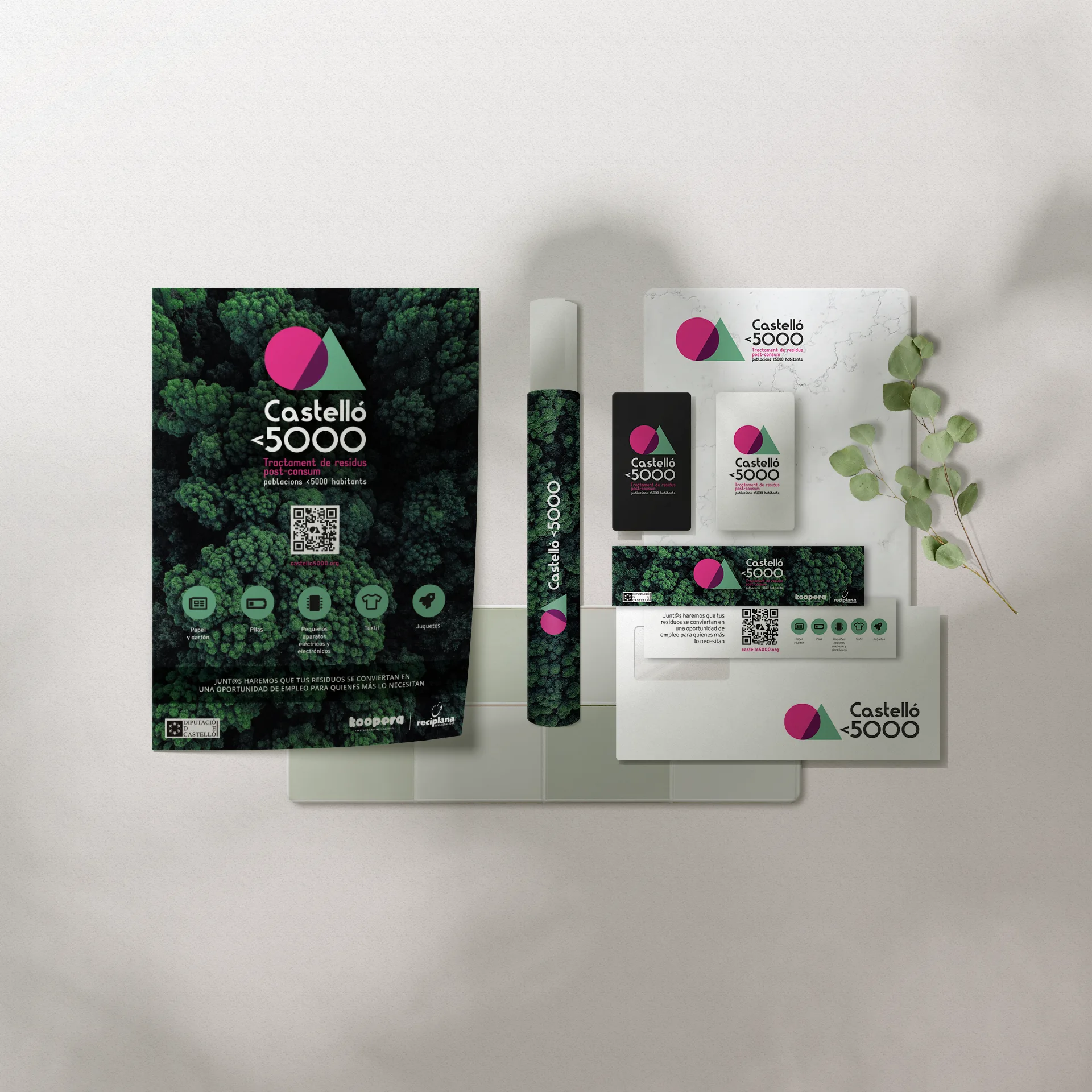 "CASTELLÓ <5000 - Tractament de residus post-consum - poblacions <5000 habitants" es un proyecto de gestión de residuos en poblaciones pequeñas. Hice una identidad que comunica modernidad y sostenibilidad. El isotipo, una abstracción geométrica representa la diversidad de objetos reciclables, simbolizando la economía circular y el reciclaje. Los colores magenta y verde suave en un diseño minimalista aporta frescura y claridad y habla de lo artificial y lo natural en que. La tipografía principal de trazo regular y redondeado, y el subtítulo con una fuente redonda y condensada en dos tonos para jerarquizar y aportar legibilidad, realzan la accesibilidad de la marca reflejando el compromiso del proyecto con la comunidad y el medio ambiente. Además diseñé diferentes aplicaciones como imágenes de redes sociales, marcapáginas,etc, y me encargué del diseño UI del sitio web oficial que puede verse en castello5000.org
