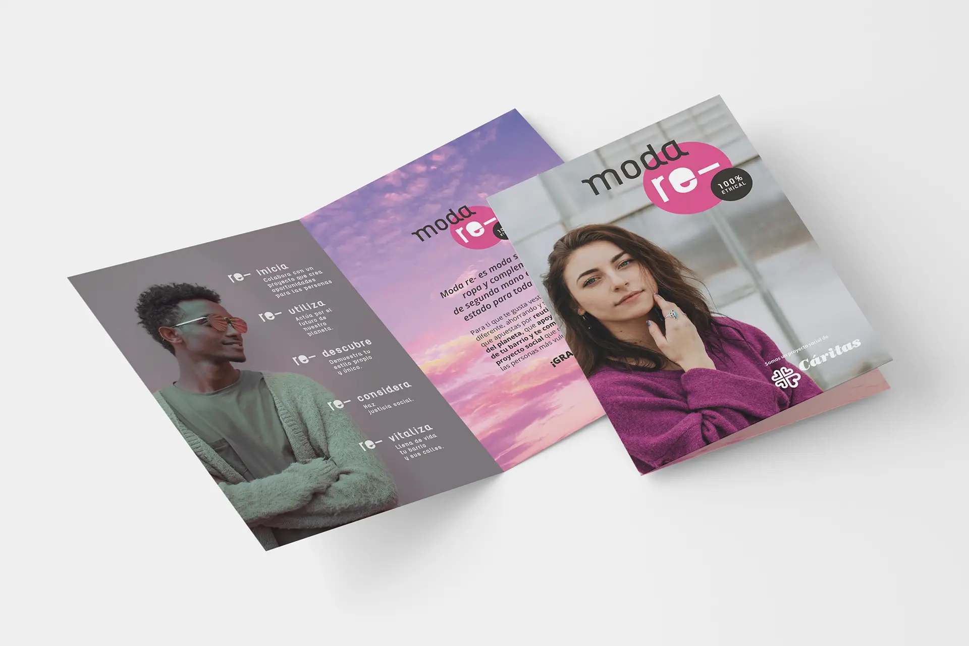 Estos flyers fueron diseñado utilizando los colores corporativos y fotografías que refuerzan la identidad visual de Moda re-, una red de tiendas de economía social promovida por Cáritas. Los textos están cuidadosamente integrados con los eslóganes de la red, destacando la modernidad, sostenibilidad e inclusividad del proyecto. El diseño busca transmitir los valores de la cooperativa, enfocada en la lucha contra la exclusión social y la defensa del medio ambiente, invitando a la participación ciudadana en la gestión de residuos textiles y la expansión de su impacto social.