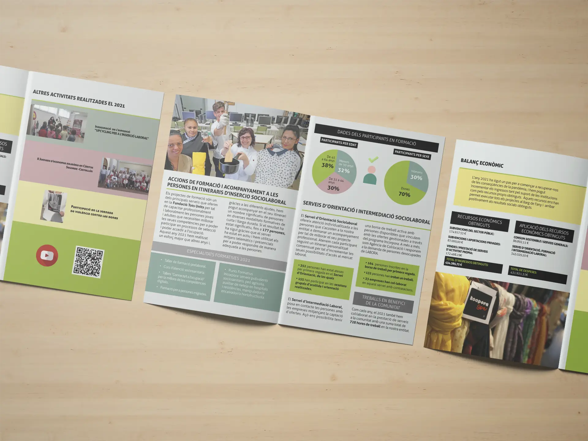He diseñado varias memorias coporativas y aquí hago una muestra de dos de ellas en formatos de folleto y desplegable. El diseño está enfocado en ser claro y visualmente atractivo, destacando los logros de las fundaciones en su misión de apoyar la inserción laboral y social de personas en situación de vulnerabilidad, así como sus servicios ambientales. La combinación de elementos gráficos refuerzan la idea de sostenibilidad y el impacto social, y facilita la comprensión de la información, manteniendo el equilibrio entre lo informativo y lo visualmente dinámico.
