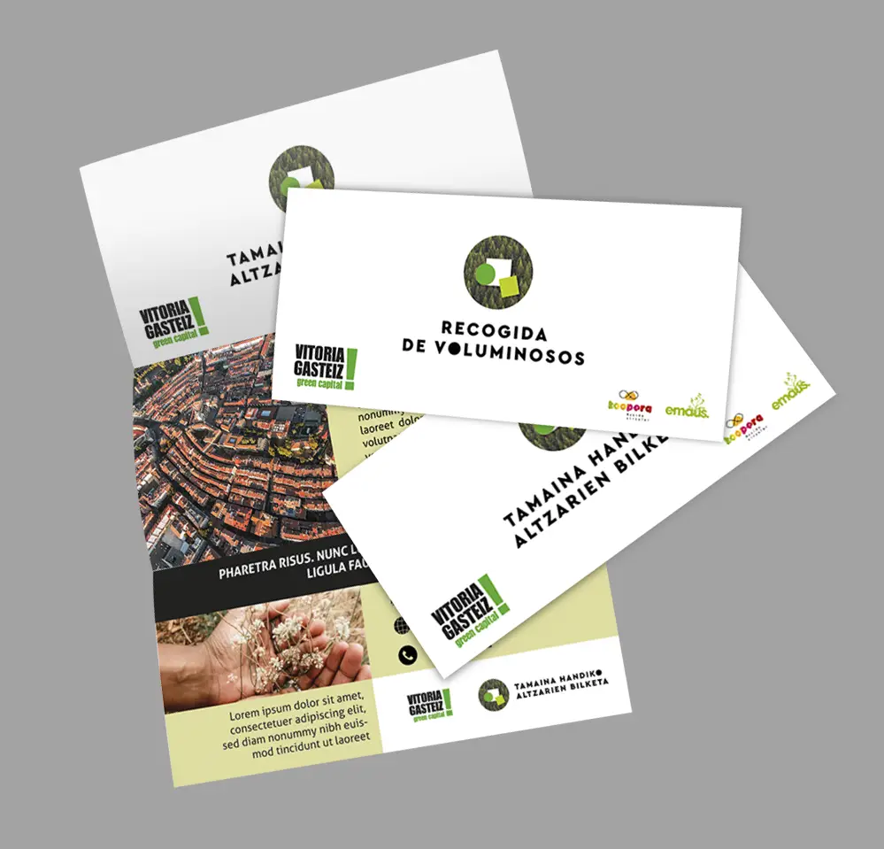 Diseñé una identidad visual bilingüe para este servicio, enfocado en la recogida de muebles y enseres. En castellano y en euskera, con versiones tanto monolingües como bilingües. Su isotipo, una composición de formas geométricas dentro de un círculo, evoca la idea de voluminosos y economía circular. La tipografía geométrica de palo seco es moderna y limpia, destacando una ‘o’ rellena que refuerza el concepto de reciclaje y circularidad. Los colores incluyen verdes y neutros, y en una versión el isotipo presenta un fondo de bosque de abetos, subrayando la conexión con la naturaleza y ecología. Para completar el enfoque ecológico, se recomienda imprimir en papel reciclado con texturas orgánicas, reforzando así todo el concepto del servicio.