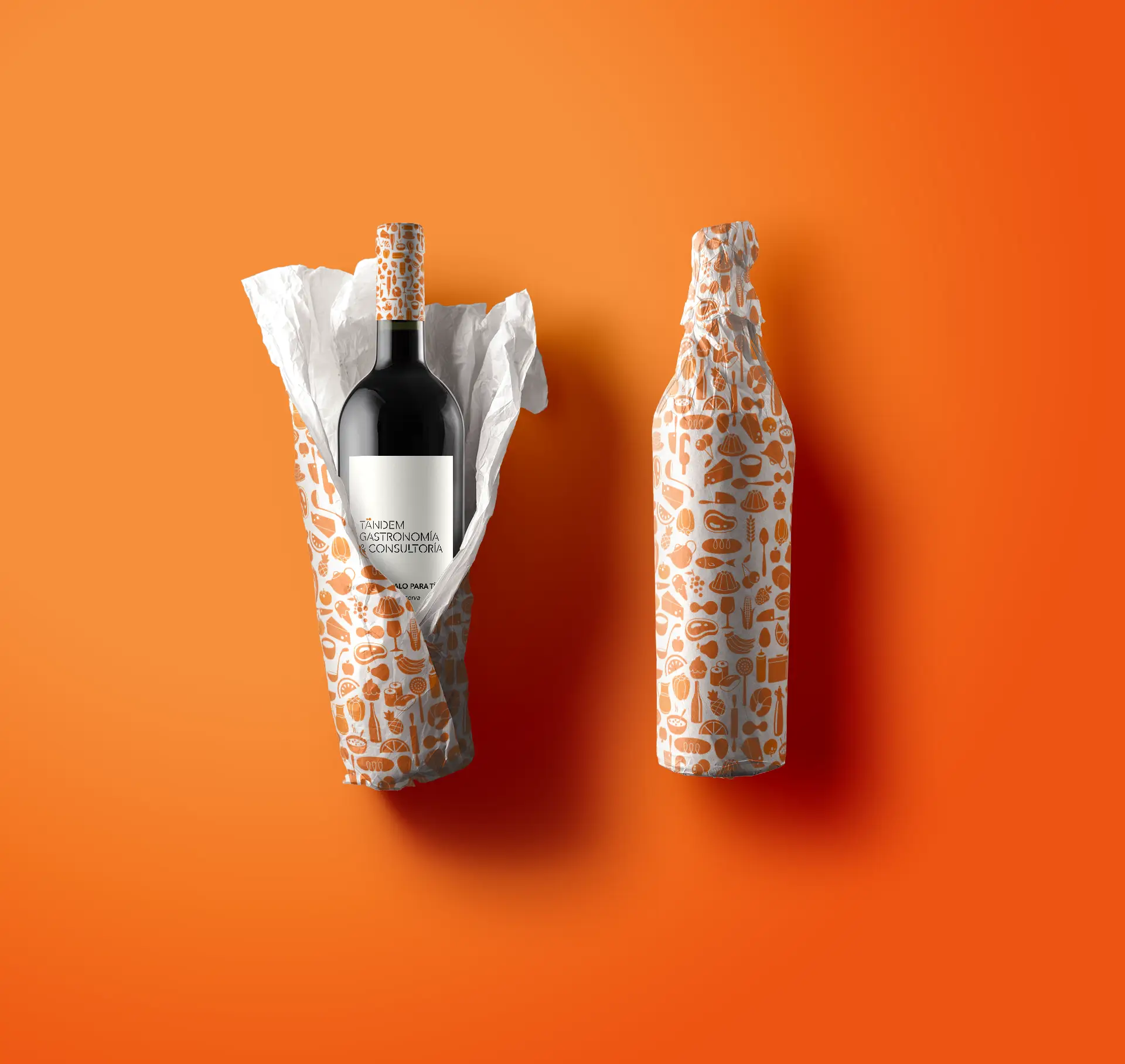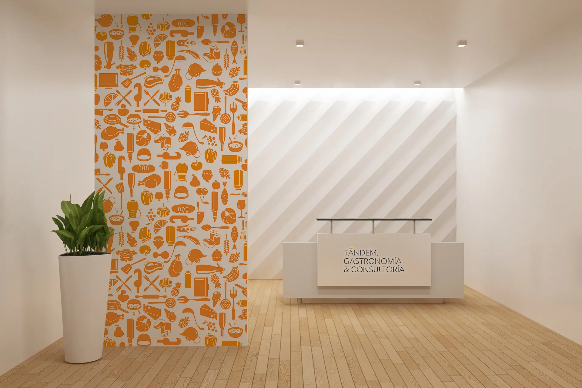 En este proyecto para Tandem, una consultoría gastronómica, el diseño se presenta como un apoyo decorativo a la marca principal, desarrollado en formato de patrón de iconos, versátil y coherente, utilizando el color corporativo naranja y una selección de íconos relacionados con la alimentación y utensilios de cocina. El patrón, sobre un fondo blanco, está diseñado para diversas aplicaciones, tales como vinilos decorativos en paredes, papeles de embalaje y otros materiales promocionales, lo que refuerza la presencia de la marca en entornos tanto físicos como visuales.